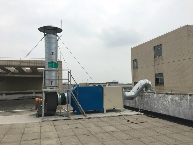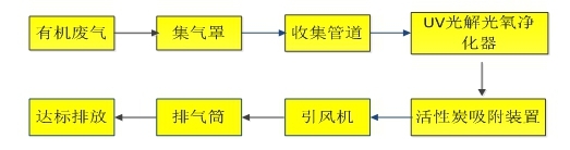 含挥发性有机化合物(VOCS)废气在引风机的抽力作用下先经UV光催化光氧进行裂解,使呈游离状态的污染物分子与臭氧氧化结合成小分子无害或低害的化合物,如CO2、H2O,然后进入活性炭吸附床,利用蜂窝活性炭多微孔及巨大的外表面积等特性将废气中的有机溶剂吸附,使废气得到净化;