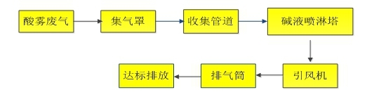 酸雾废气:废气由风机引出后,首先进入酸雾废气净化塔。吸收塔中碱性洗涤液由循环泵抽至塔中经填料向下流动,酸雾废气逆流上升,在填料的湿润表面气液接触,发生一系列的物理化学反应,并由于浓度差而发生传质过程,从而完成了将气体的净化过程,净化后的废气脱水后经离心风机引出后达标排放。循环液定期排放至污水处理站;