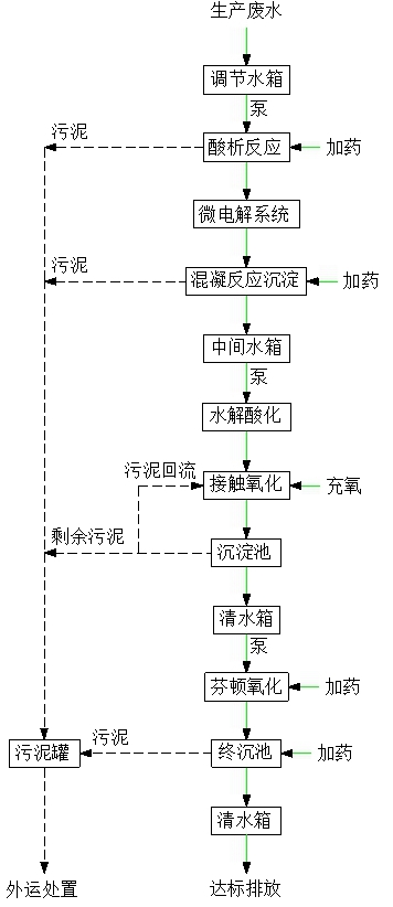 根据此类废水的特点,单纯的生化处理工艺是不能满足二期厂房废弃油墨处理的要求的,必须使用物理、化学和生化相结合的综合处理工艺。酸析、混凝工艺作为二期厂房废弃油墨预处理的主要手段,对去除COD和色度比较高效而且可靠。为了提高废水的可生化性,先进行微电解和水解酸化工艺等处理,然后再进行好氧生化处理,处理效果会更佳。